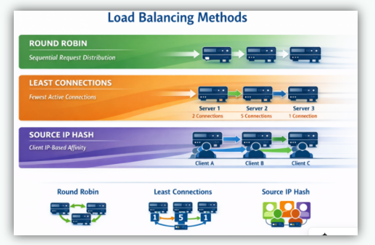 Basic load distribution without session awareness, suitable for simple or external DNS based balancing.