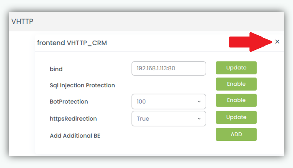 Clicking the Delete (✕) icon will remove the frontend and all associated frontend level